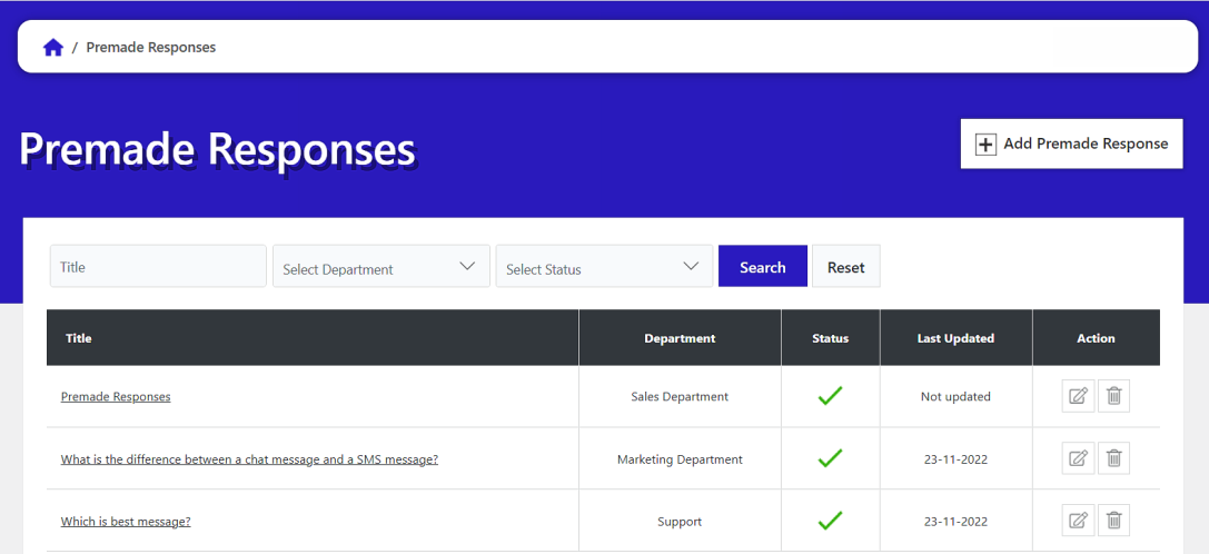 Agents can also add premade responses for tickets and insert them while responding to any ticket with a single click.