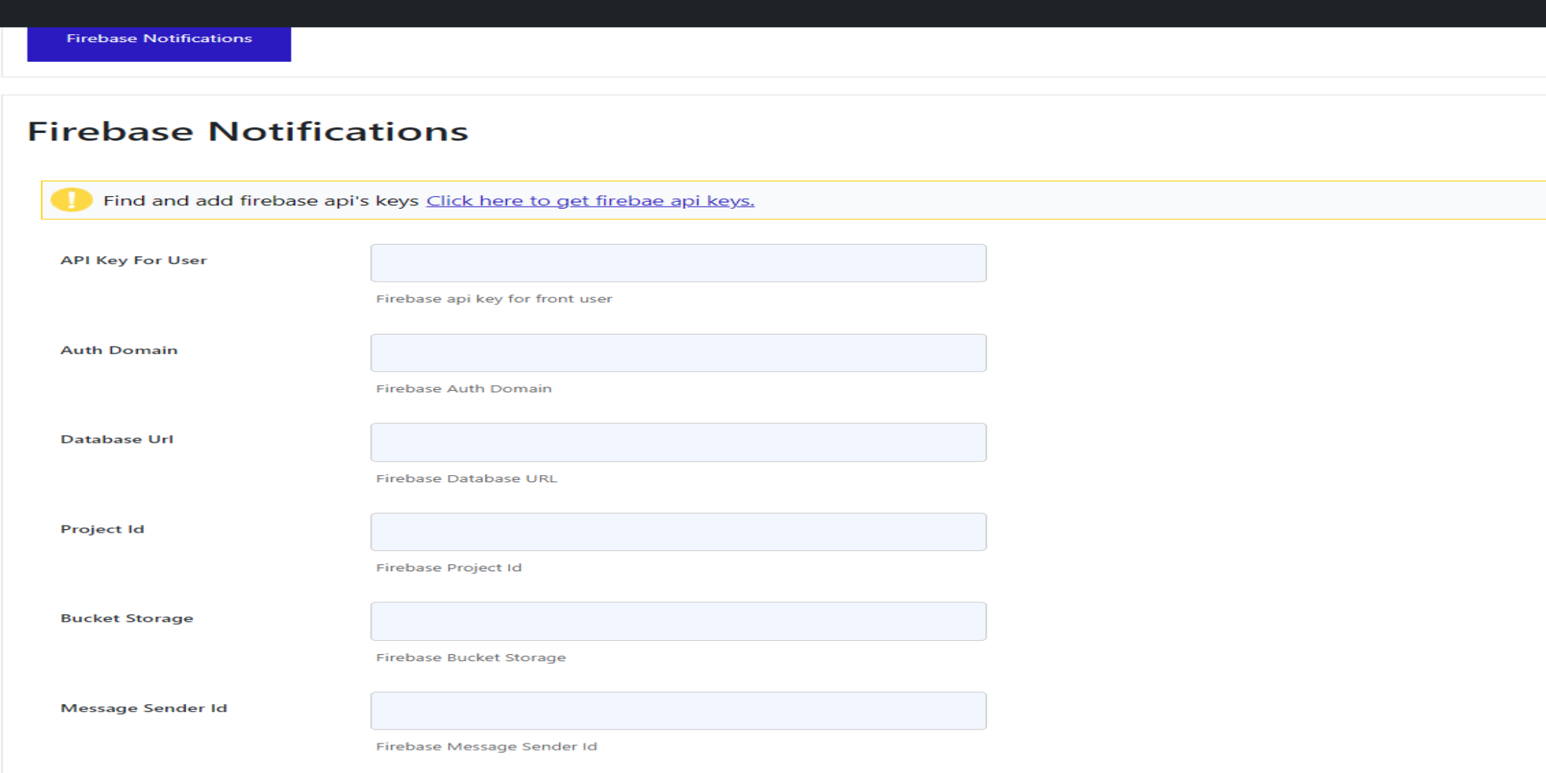 An administrator will configure the desktop notification settings by going to the push notification section under the system settings after the add-on has been enabled. You will need some API keys to configure it; therefore, you may find and add Firebase API keys through the Firebase link, which is available as the link shown in the screenshot below.